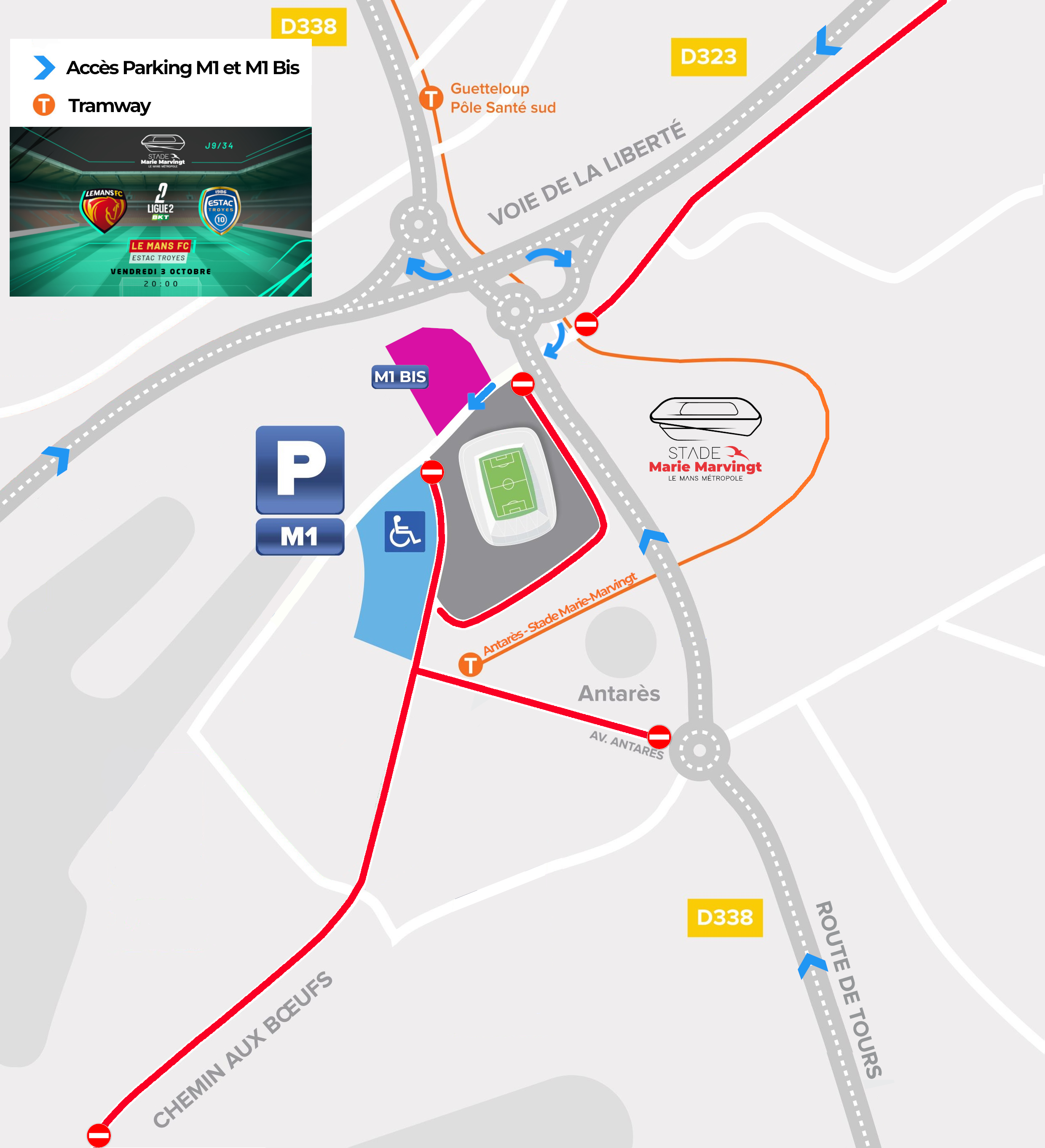 Vendredi 03 octobre, le Stade Marie-Marvingt reçoit à 20H00 la rencontre LE MANS FC / ESTAC TROYES pour le compte de la 9ème journée de Ligue 2 BKT. Dans le même temps, le circuit des 24 Heures du Mans accueillera le GP Explorer. Compte tenu de l'affluence importante attendue aux abords du Stade Marie-Marvingt et dans le but de réserver au public les meilleures conditions d’accueil, il convient de suivre les recommandations suivantes.