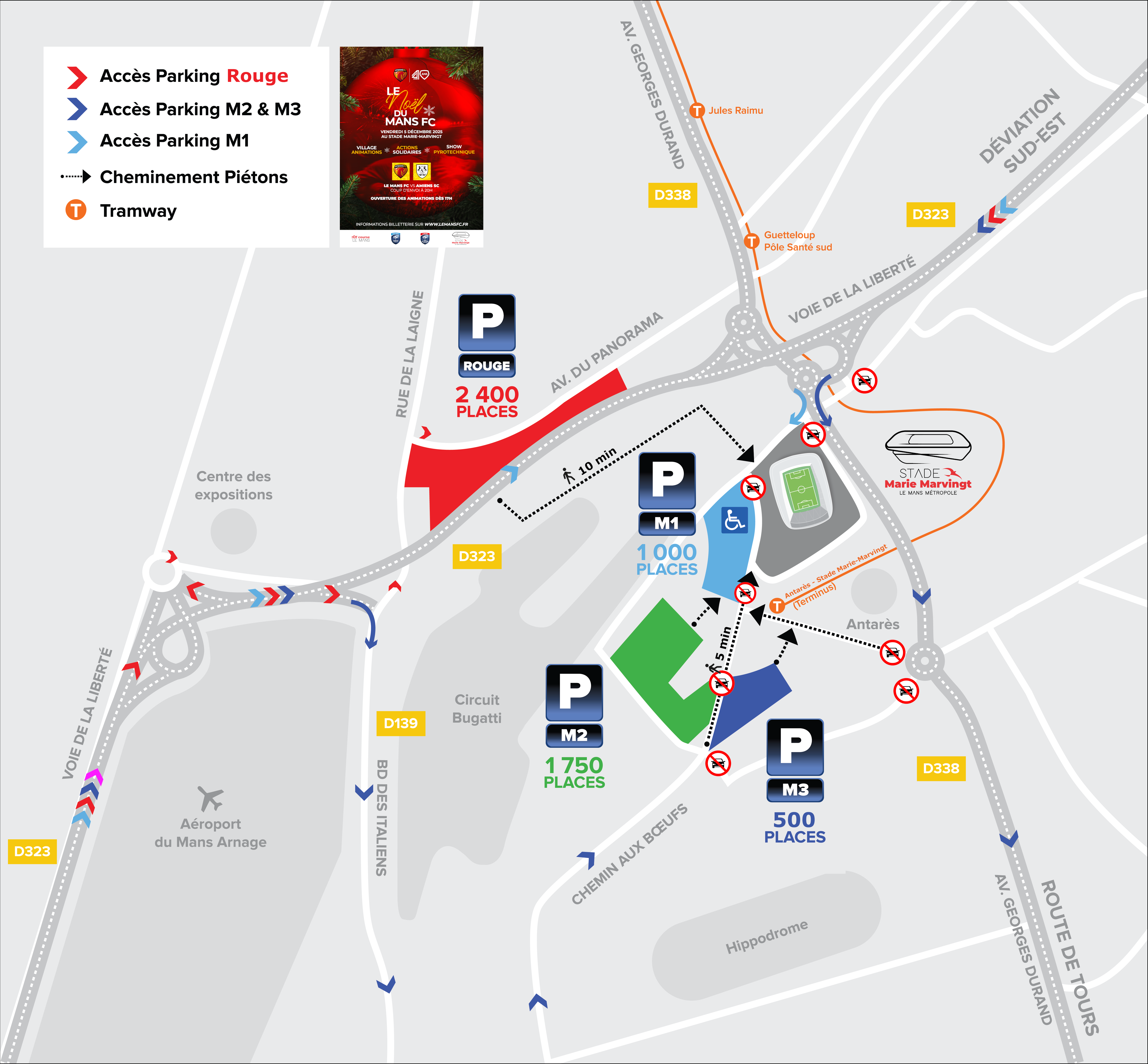 Vendredi 05 décembre, le Stade Marie-Marvingt reçoit à partir de 17H30 la grande fête le Noël du Mans FC organisée à l'occasion de la 16ème journée de Ligue 2 BKT face au Amiens SC. Devant l'importante affluence attendue (plus de 20.000 spectateurs) et dans le but de réserver au public les meilleures conditions d’accueil, il convient de suivre les recommandations suivantes.