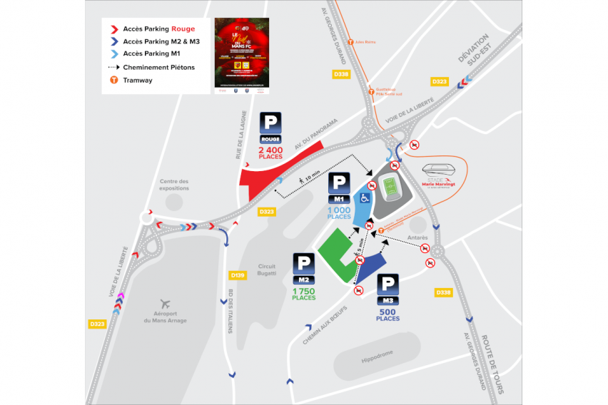 Pour accéder à ces parkings dans les meilleures conditions, il convient d'éviter la route de Tours (RD338) et de privilégier Arnage, Ruaudin ou le bd des Italiens-RD139. Suivre la signalétique Parking M2, Parking M3.