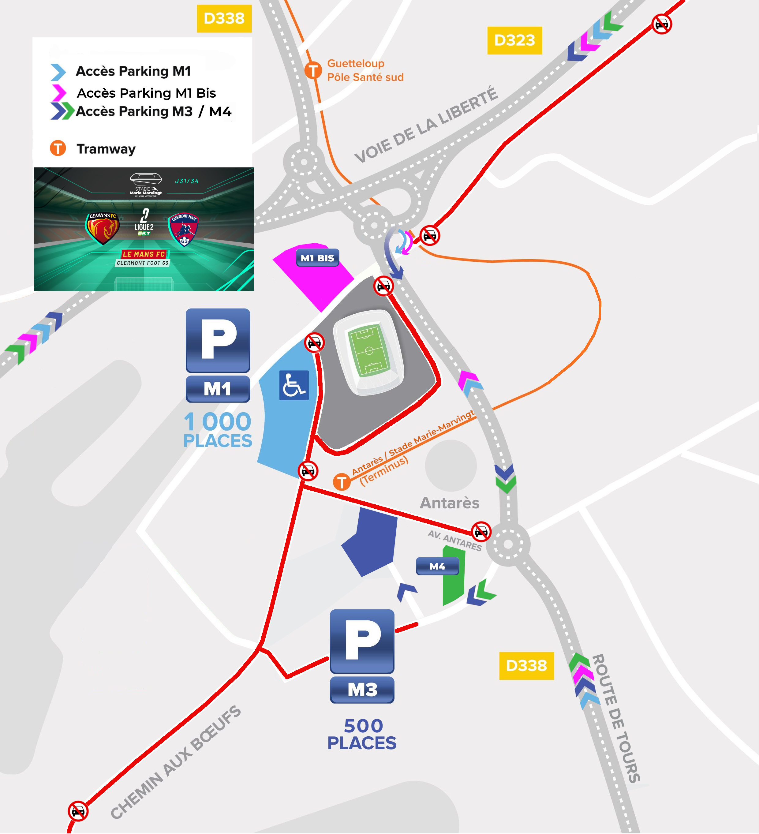 Vendredi 17 avril, le Stade Marie-Marvingt reçoit la rencontre entre Le Mans FC et Clermont à 20H00 pour le compte de la 31ème journée de Ligue 2 BKT. Compte tenu de l'affuence importante attendue dans la zone, notamment en raison des 24H du Mans Motos, et dans le but de réserver au public les meilleures conditions d’accueil, il convient de suivre les recommandations suivantes.
