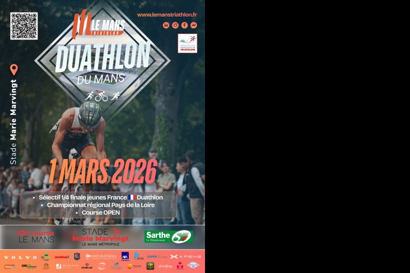 Cette nouvelle épreuve Sarthoise et Mancelle lancée en 2025 se déroulera le Dimanche 1er Février aux abords du Stade Marie-Marvingt, une épreuve unique dans le département. Le duathlon, discipline officielle de la Fédération Française de Triathlon, est une épreuve ou l’on enchaine une course à pied, une course de vélo et à nouveau une course à pied.